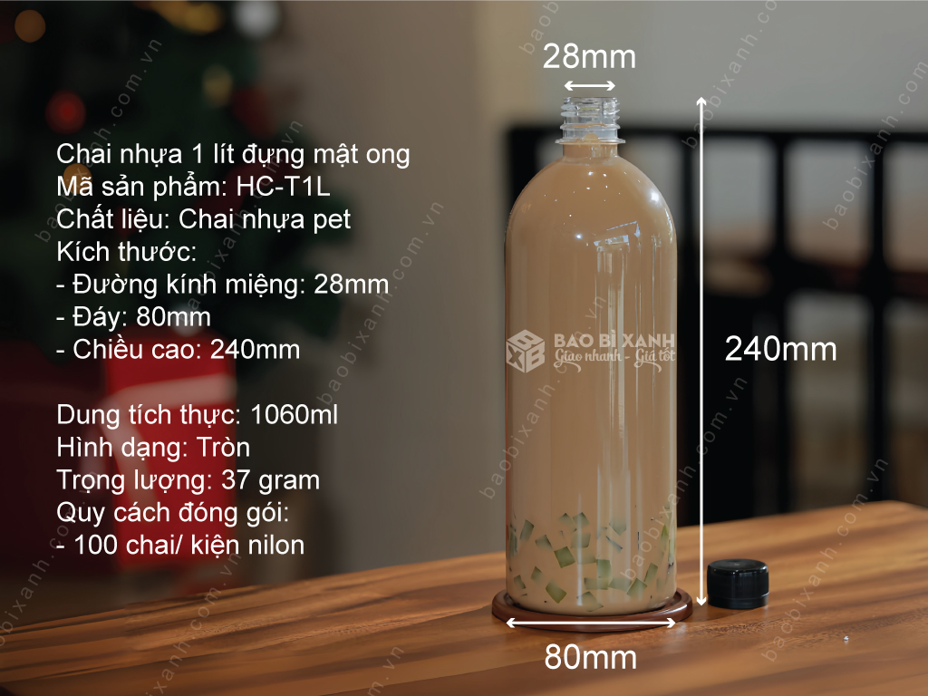 Chai nhựa 1 lít đựng mật ong là sản phẩm làm từ nhựa pet nguyên sinh, an toàn cho thực phẩm. Chai thường được sử dụng để đựng mật ong, nước uống, nước hoa quả, nước giải khát, dầu gội, sữa tắm, nước rửa tay, nước lau sàn và nhiều sản phẩm khác.Chai có miệng rộng 28mm và nắp vặn kín, giúp bảo quản chất lỏng bên trong tốt hơn và tránh bị đổ ra ngoài.