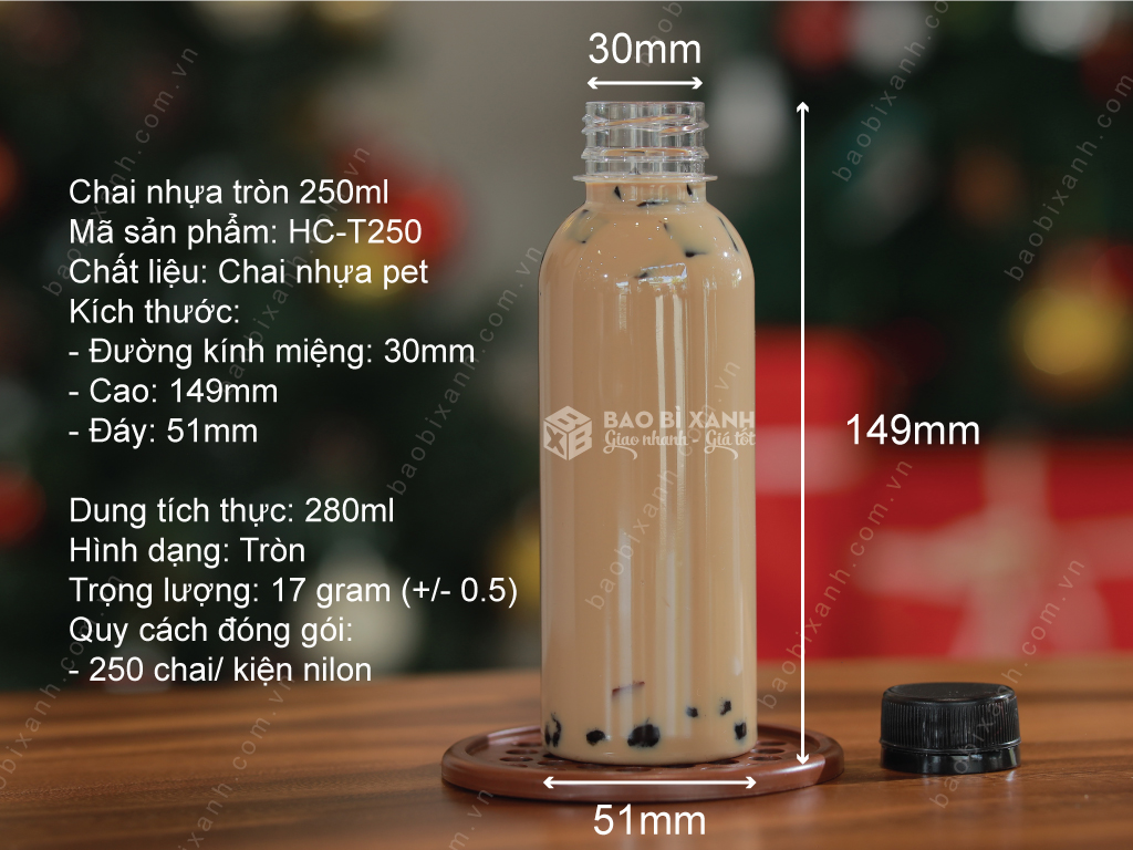 Với dung tích 250ml, chai nhựa thích hợp đựng trà sữa, nước ép trái cây, sinh tố,...cho mọi quán cà phê, nhà hàng, quán trà sữa, kinh doanh đồ uống,...cho thực khách mua mang về rất tiện lợi.