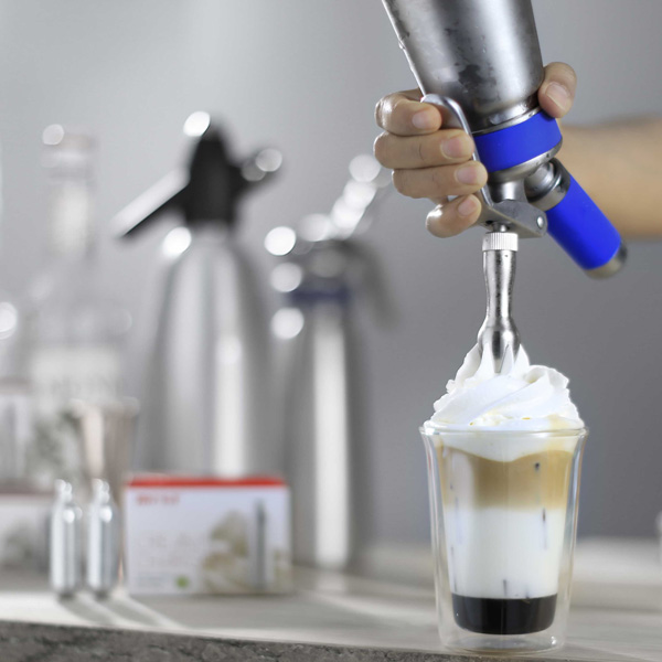 Bên cạnh máy đánh kem, bình xịt kem cũng là một dụng cụ hữu ích và cần thiết không kém. Bình xịt kem tiện lợi dùng khi đánh bông kem mịn và xịt kem đẹp mắt lên mặt cốc trà sữa. Sử dụng bình xịt kem dễ dàng điều chỉnh lượng kem phù hợp, nhanh chóng, tiết kiệm thời gian và đảm bảo vệ sinh.