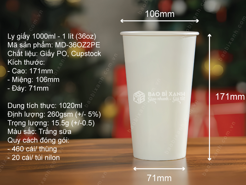 Ly giấy trơn 32oz dung tích tương đương 1000ml phũ 2 lớp PE. Chống thấm nước nóng và lạnh. Không bị mất định hình khi để lâu. Bao Bì Xanh cung cấp số lượng lớn ly giấy trơn, ly giấy in hình Giá rẻ & đa dạng mẫu mã. Ngoài ra còn cung các vật dụng đi kèm như muỗng cafe, muỗng trà sữa, ống hút nhựa, ống hút giấy...