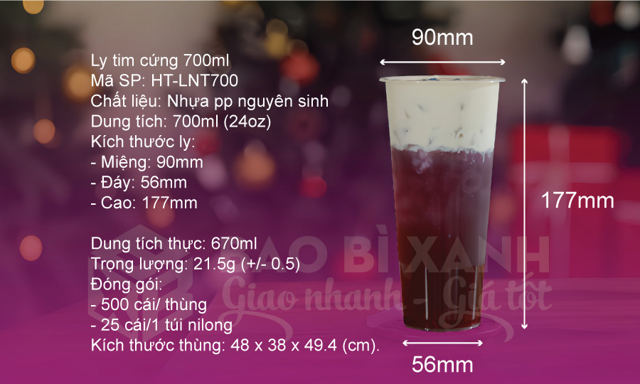 - Ly tim cứng 700ml là sản phẩm chuyên dùng làm ly đựng trà sữa size L, ly đựng các loại trà trái cây hiện đại. Các món trà vải đậu biếc, macchiato và kem kem cheese sẽ rất thiếu sót nếu không sử dụng dòng sản phẩm này.