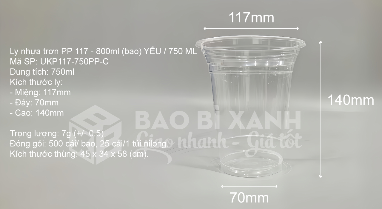 - Tên sản phẩm: Ly nhựa trơn PP 117 - 800ml (bao) YẾU / 750 ML