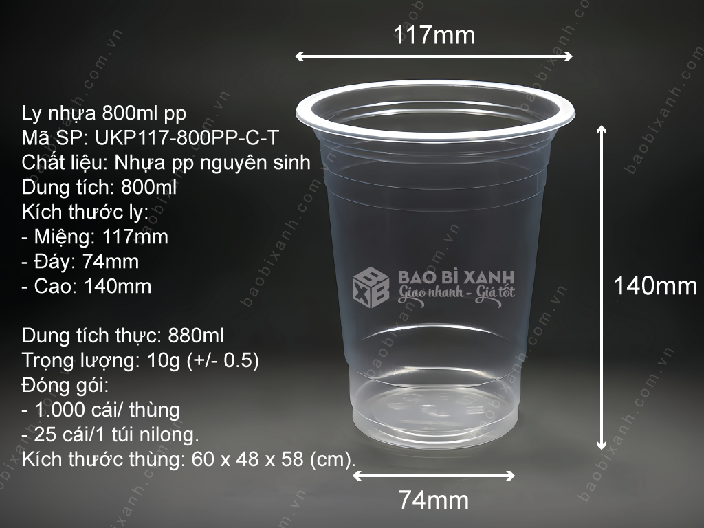 Ly nhựa 800ml pp hay còn gọi là ly 800ml đủ, là dòng sản phẩm chuyên sử dụng ở các cửa hàng trà tắc, nước mía, nước sâm. Ly có nhiều chủng loại dày, mỏng với quy cách đóng gói khác nhau từ bao đến thùng. Tùy từng chủng loại mà ly được đóng gói 500 cái/bao hoặc 1.000 cái/thùng.