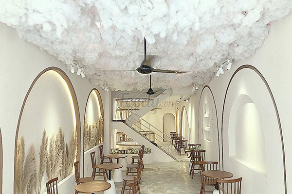 Tông màu be chủ đạo, cùng những khung cửa hình vòng cung chính là đặc trưng của lối kiến trúc này. Chưa kể, chủ quán còn rất tinh tế khi tạo điểm nhấn cho trần nhà bằng những đám mây bằng bông gòn bồng bềnh độc đáo.