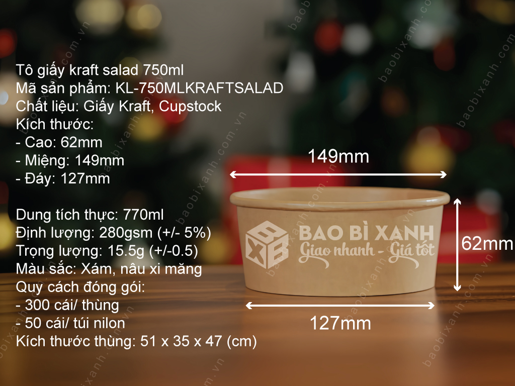 Tô kraft salad 750ml được thiết kế đựng đồ nóng và đồ lạnh hoàn hảo. Thiết kế miệng to, thân lùn và đáy cũng có đường kính phù hợp. Tô có kiểu dáng hiện đại, cân đối để đựng cả đồ ăn nóng và lạnh, giữ cho thức ăn bên trong luôn thơm ngon, tươi sạch.